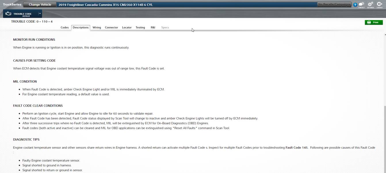 Step 3 – Gain a general idea of how the system of the related code functions and interacts with other vehicle systems. This type of information is found in service and repair data like TruckSeries truck repair information from Mitchell 1. Understanding how systems operate and work together gives you a “big picture” view that will help in tracing down why something took place to set the code.