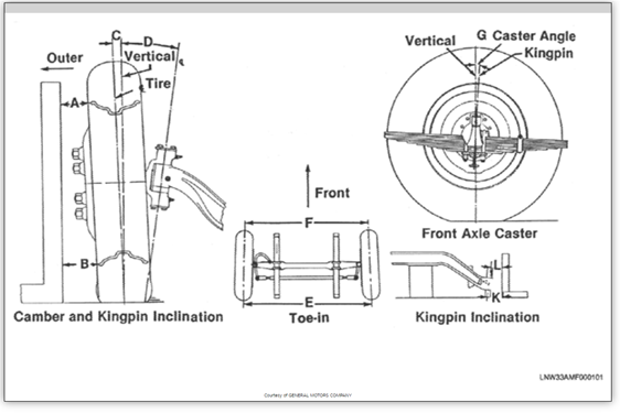 FRONT AXLE CASTER = Front axle caster is described as the kingpin inclination from the vertical plane in fore and aft vehicle direction (G). Incorrect caster may a result of sagging springs, bent axle, twisted axle, or unevenly tightened spring U-bolt nuts. Ensure all U-bolt nuts are tightened equally. Usually if an axle is twisted caster will be unequal for both right and left side.