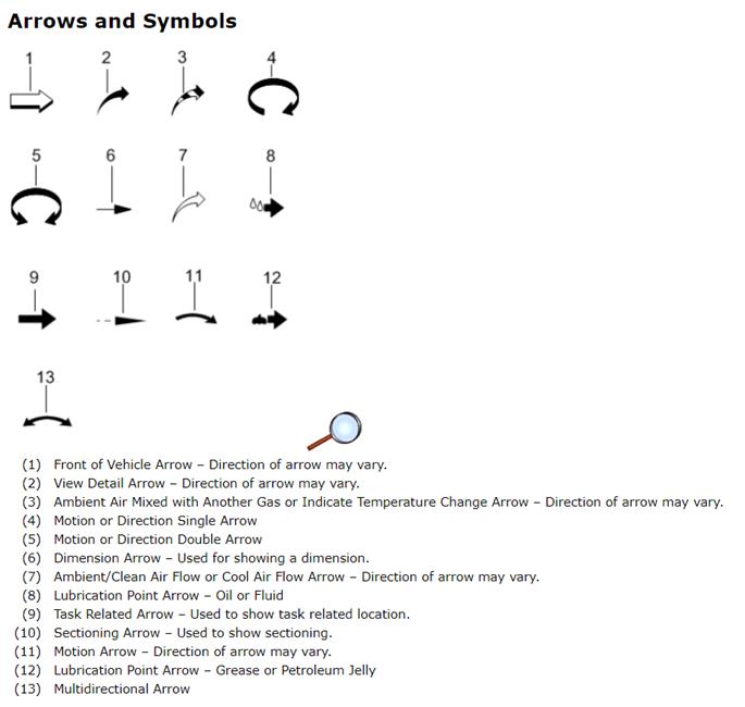 As we move on to the Arrows and Symbols we have 13 different icons providing important information. These help identify front of vehicle, motion, dimensions, and points for lubrication, etc. Problem is how does one remember these colors and symbols. If you have access to a printer make a copy of this and stick it in your tool box or as usual this information is always readily available in TruckSeries truck repair information.