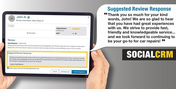 The AI-driven Suggested Responses feature makes it easier than ever for auto repair shops to respond to Google and SureCritic customer reviews. Suggested Responses provide automated, personalized replies that are tailored to individual reviews, allowing shops to easily customize and manage their responses directly from their SureCritic dashboard.