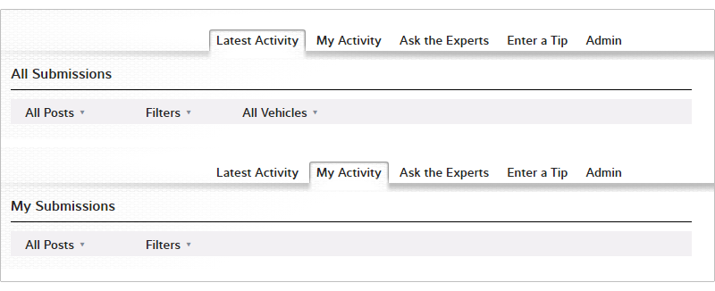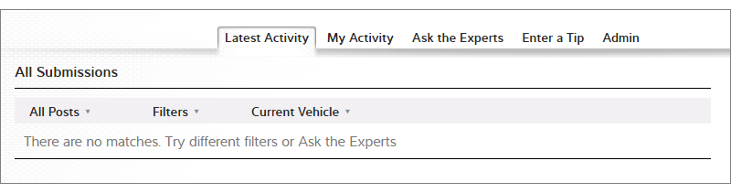 The Latest Activity and My Activity lists contain questions, tips and fixes for all vehicles by default. If you have a vehicle selected, the Latest Activity may show the posts for that vehicle for the past 90 days. To go back to viewing the posts for all vehicles, click “Current Vehicle” in the toolbar below the section heading and select “All Vehicles”.