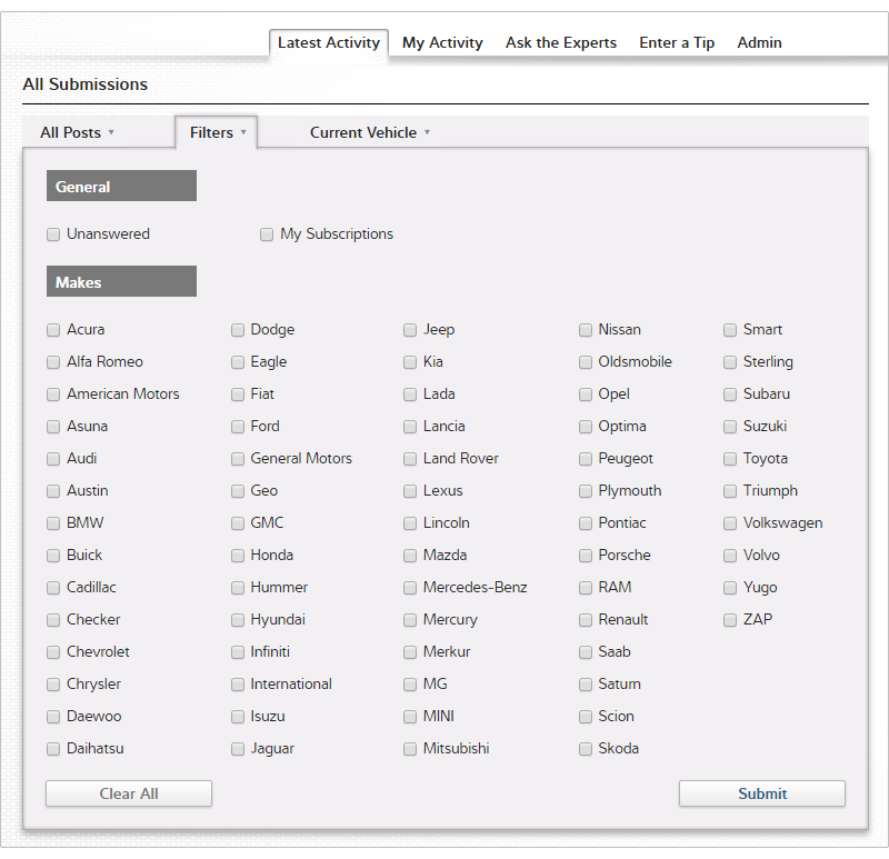 To filter by makes and/or unanswered questions, click “Filters” in the toolbar below the section heading. When this opens the filter choices, select one or more option and then click the Submit button at the bottom to apply. To clear the filters, click “Filters” and then click the Clear All button and either re-select or click Submit to close the options. You can use a combination of both filter types on the list. If you have your preferred vehicle selections set up in your Community profile, you can click the “My Subscriptions” choice to select them.