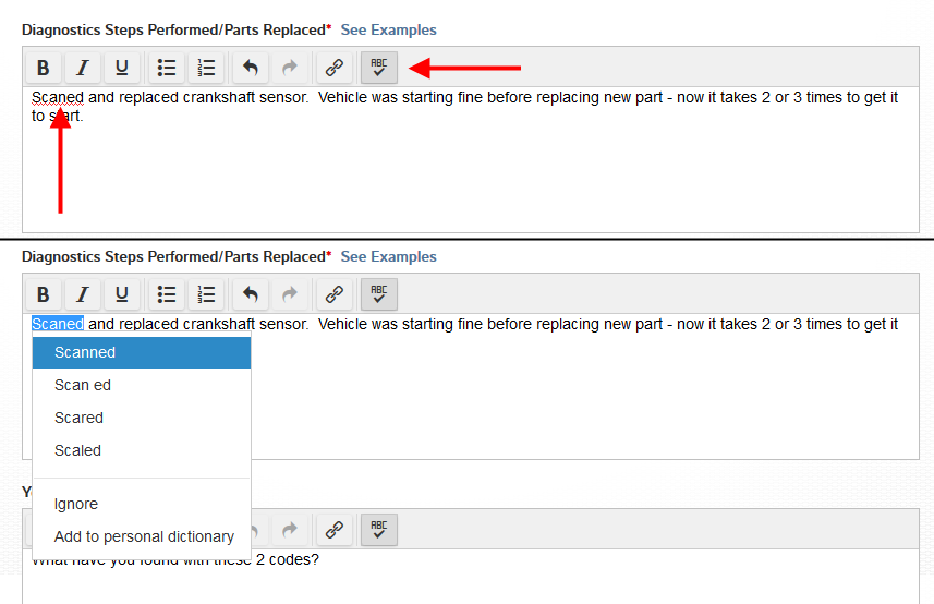 By default, spellchecking is turned on in the SureTrack Community when you add content either through asking a question, sharing a tip or replying to other user’s posts. On the toolbar above the text boxes is an icon with the letters ABC with a checkmark below. If the icon is highlighted like in the image below, the spellcheck function is on. As you type, the system will recognize misspelled words and indicate them with a red squiggly line below the word. If you right-click on the misspelled word you will get a menu with suggested alternatives if there are any. Just click on the one that is correct and it will replace the word. You will also get a choice to ignore the word or add it to your personal dictionary. Not all technical terms and acronyms are included in the standard dictionary so you may want to add them to your personal dictionary if you know it is correct. It is suggested that you correct the spelling in your posts to make it easier for other users to read and also to help the search engine find the right content later on.