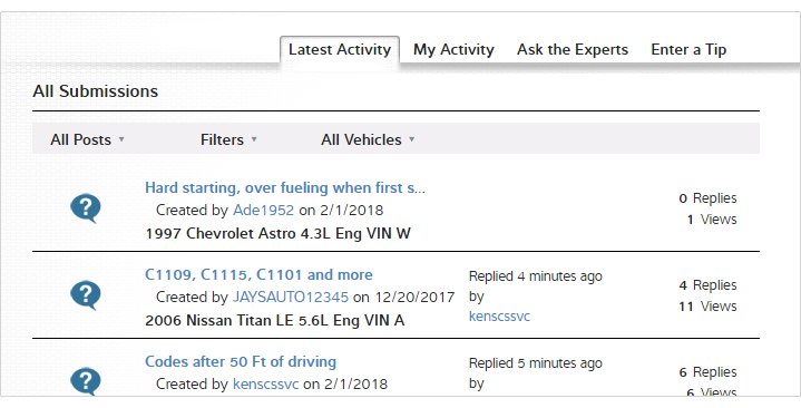The Latest Activity list contains posts for the past 90 days. When limited to showing posts for your currently selected vehicle, it uses Year, Make, Model and Engine as qualifiers. If your current vehicle had no posts in the past 90 days, you will get a message that there are no matches. You can try switching back to “All Vehicles” and then use the filters to select the make you’re working on to see more posts which may apply to similar vehicles. Click here for more information on filtering results.
