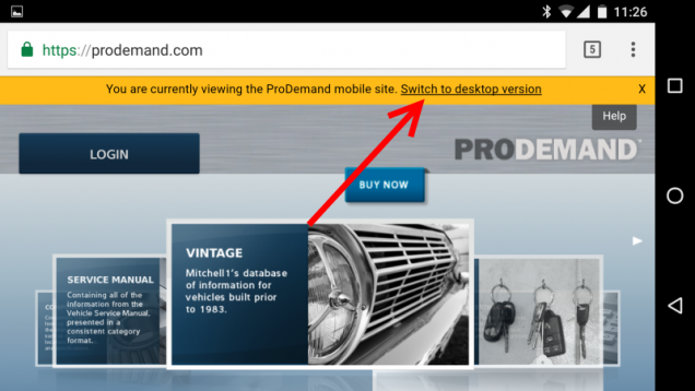To access the SureTrack Community on your phone or tablet you need to use the desktop version of ProDemand, ShopKey Pro or SUN Collision. When you first get to the program, you should see a yellow bar at the top of the screen that tells you which version you are on and a link to switch it. If you are in the mobile site, click the link to change to the desktop site. If you don’t see the yellow bar you may already be logged into the product. Log out of the product and go directly to www.ProDemand.com, ShopKey Pro or SUN Collision.