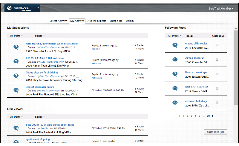 The SureTrack® Community gives you access to thousands of professional automotive technicians across North America. You can not only get help with difficult vehicle questions but can contribute to the community by answering other technicians’ questions and share tips for vehicle diagnostics and repair. The community includes a robust automated notification and subscription system which helps you get answers to your questions quickly, typically within a few minutes. The community has many members who monitor questions for particular vehicle lines to ensure that the questions get answered quickly. Once you have repaired the vehicle, you are encouraged to close out your question with the fix which then becomes part of the greater SureTrack data system to help future technicians who may come across the same issue.