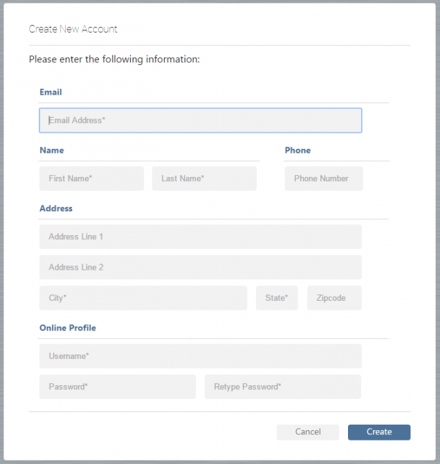 - Basic Account Information – Fill out the form completely. Fields marked with an “*” are required. Use a valid e-mail address that you have access to so that you can get notifications from the system. Click the “Create” button.