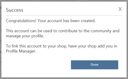 - Success Message – If you filled out the Basic Account Information form correctly and hit the “Create” button you should get the Success message shown below indicating that your basic account information has been accepted. Click the “Done” button but note that you are not finished creating your complete community user account and need to continue through the following steps.