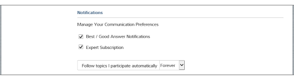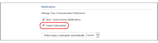 NOTE: When you reply to a community question, the default setting is to automatically set the follow choice for that post. To change the default, log into your profile and change the setting under the Expertise section.