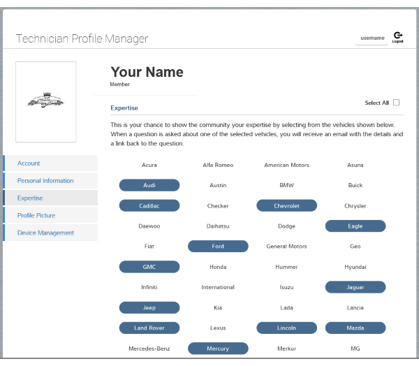If you have expertise with certain vehicle makes and would like to also become a SureTrack Community Expert, you first start by subscribing to the makes you specialize in. You will then get notified of new questions for these vehicles. The subscription settings are located in the Profile Manager. You need to be logged in with your SureTrack Community Member Account, and click your name near the top right of the screen and select Profile Manager. Log into the Profile manager and then click the “Expertise” link on the left. Select the makes you specialize by clicking on them to highlight them. You can also use the Select All link to select all makes if you wish. You can also use this to clear the list to start over.
