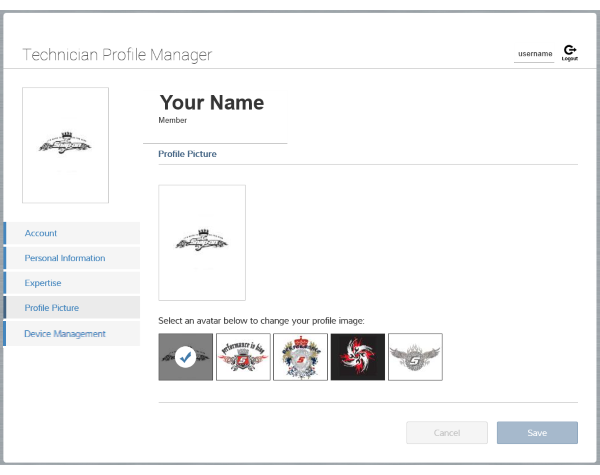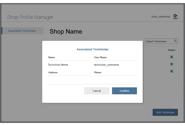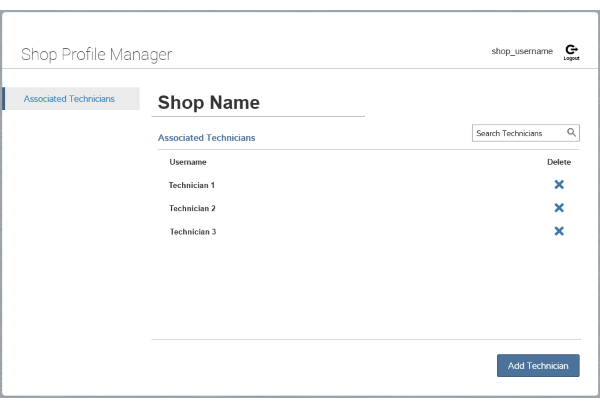 To remove a technician from your account, click your shop name near the top right of the page and then click on “Profile Manager” from the drop-down menu. Use your shop credentials to log into the Profile Manager where you will be presented with a list of associated technician accounts. Click the “X” to the right of the technician you want to remove.