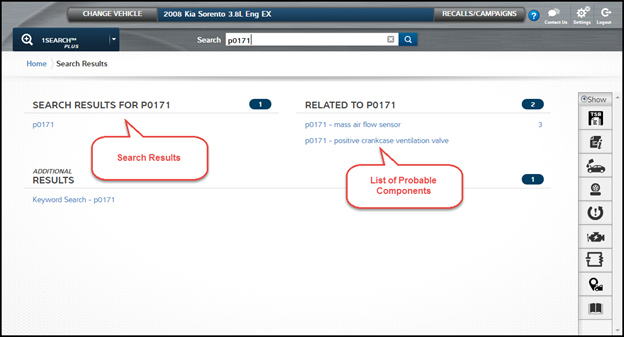 After you select your vehicle, you will automatically be navigated to the 1Search Plus module. This module will initially look very much like the original 1Search module. We’ll navigate forward by entering “p0171” into the search field.