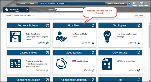Information returned for your search is brought back in a “card” format. Each card contains a specific data set which is labeled on the card. Cards are only returned if there is relevant information behind the card, and all of them contain a mix of real world and OEM information. The cards are ordered according to typical technician diagnosis and repair workflow.