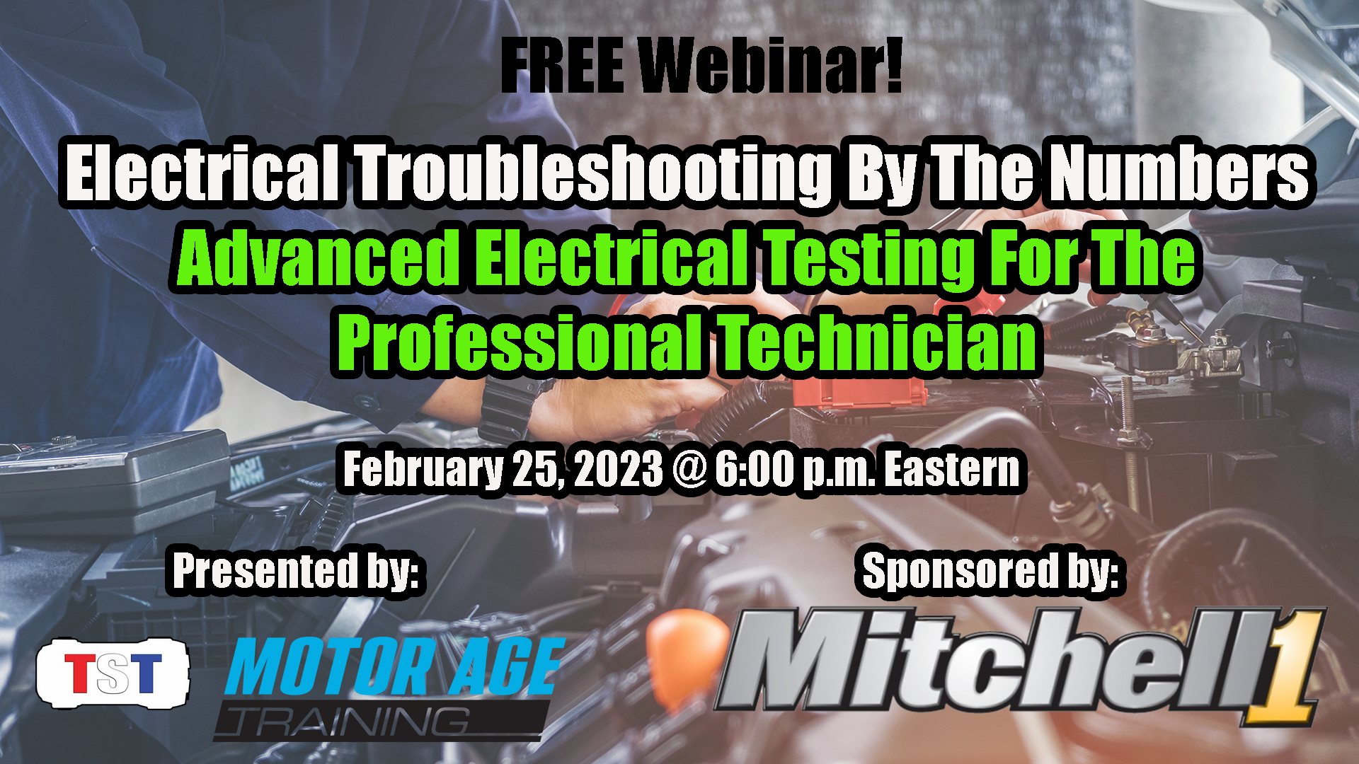 Mitchell 1 will sponsor a free webinar on Saturday, Feb. 25, at 6 p.m. EST titled, āElectrical Troubleshooting by the Numbers ā Advanced Electrical Testing for the Professional Technician.ā