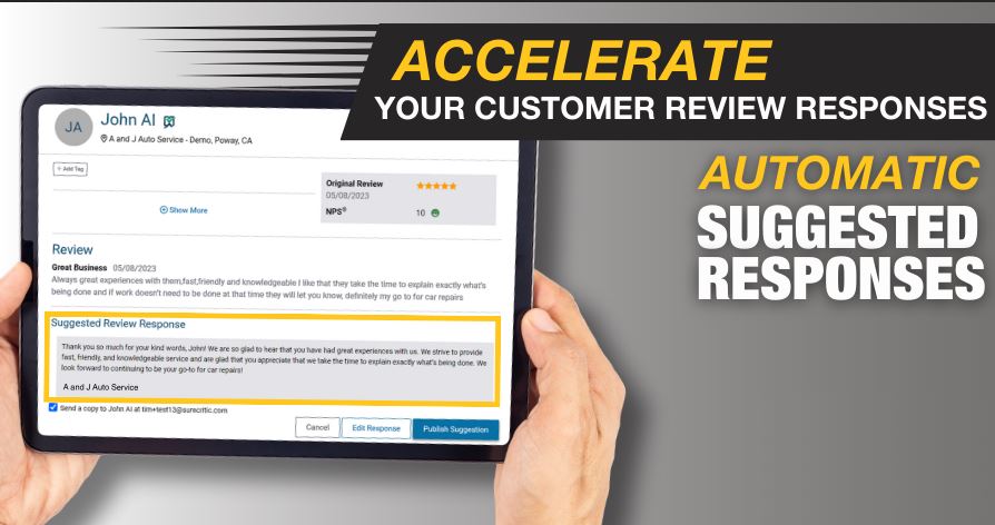 The advanced technology enables busy shop owners to effortlessly create thoughtful, professional responses to Google and SureCritic reviews within seconds. Suggested Responses takes the guesswork out of responding with a unique, pre-crafted customizable response for various review scenarios.