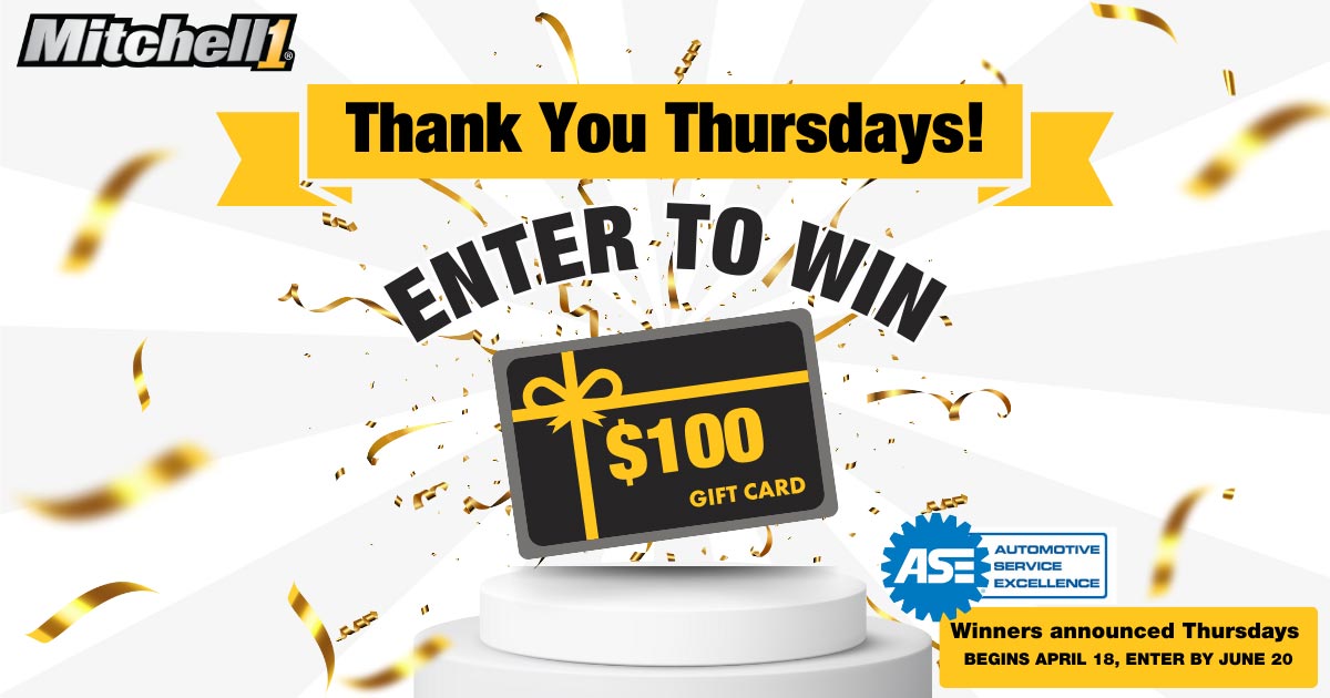In celebration of Automotive Service Professionals Month, Mitchell 1 announces the return of its beloved “Thank You Thursdays!” sweepstakes. Learn how hardworking service professionals, like yourself, can enter today for a chance to WIN $100! Ten lucky winners will be awarded over the next 10 weeks, so don’t miss out… Enter Now!