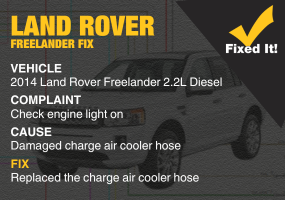 The customer reported that the check engine light was on in their 2014 Land Rover Freelander. After connecting a scan tool, a P00B8 code was found, indicating a correlation issue with the mass or volume air flow. A subsequent road test revealed a hissing sound, prompting a smoke test that identified a leak from the damaged charge air cooler hose. The hose was replaced, codes cleared, and a successful road test demonstrated proper vehicle operation with no fault codes or warning lights.
