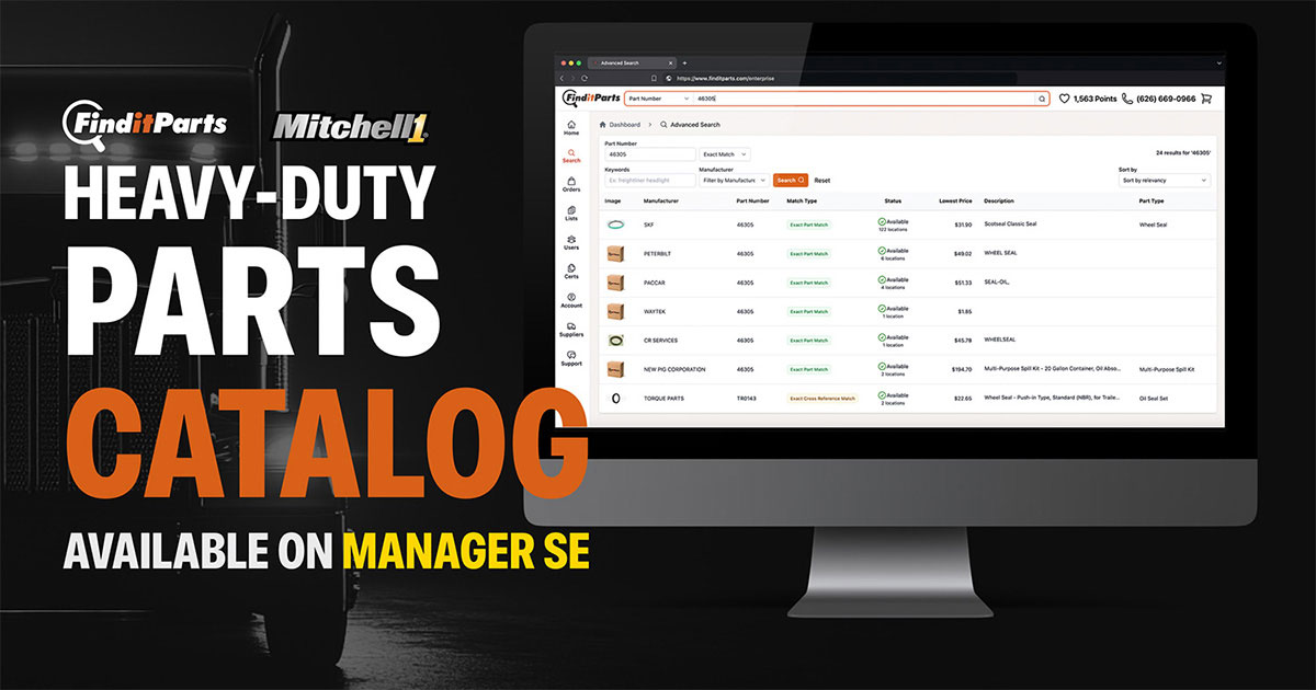 The FinditParts Infinite Warehouse catalog is now fully integrated with Mitchell 1’s Manager SE Truck Edition software. It is the first-ever online parts catalog for Class 4-8 vehicles that works hand-in-hand with a shop management system.