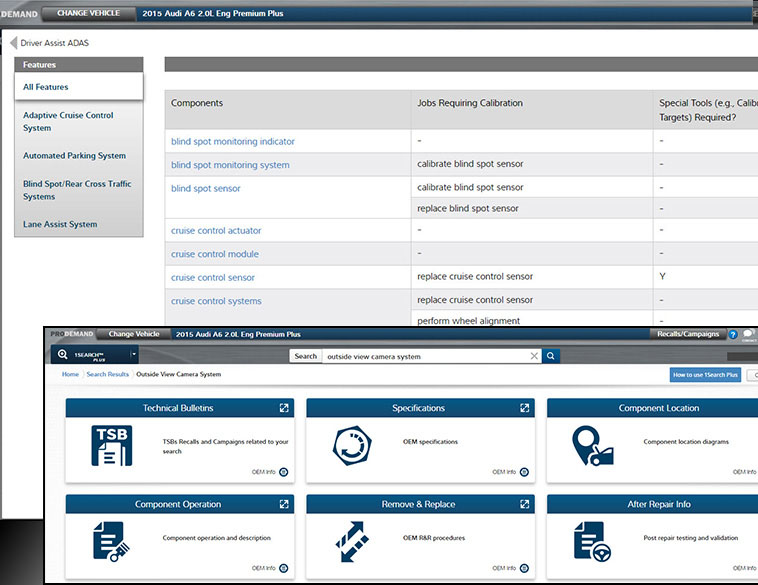 Starting with the QuickLink ribbon on the very first screen of ProDemand, you’ll find vehicle-specific ADAS information such as this 2015 Audi.