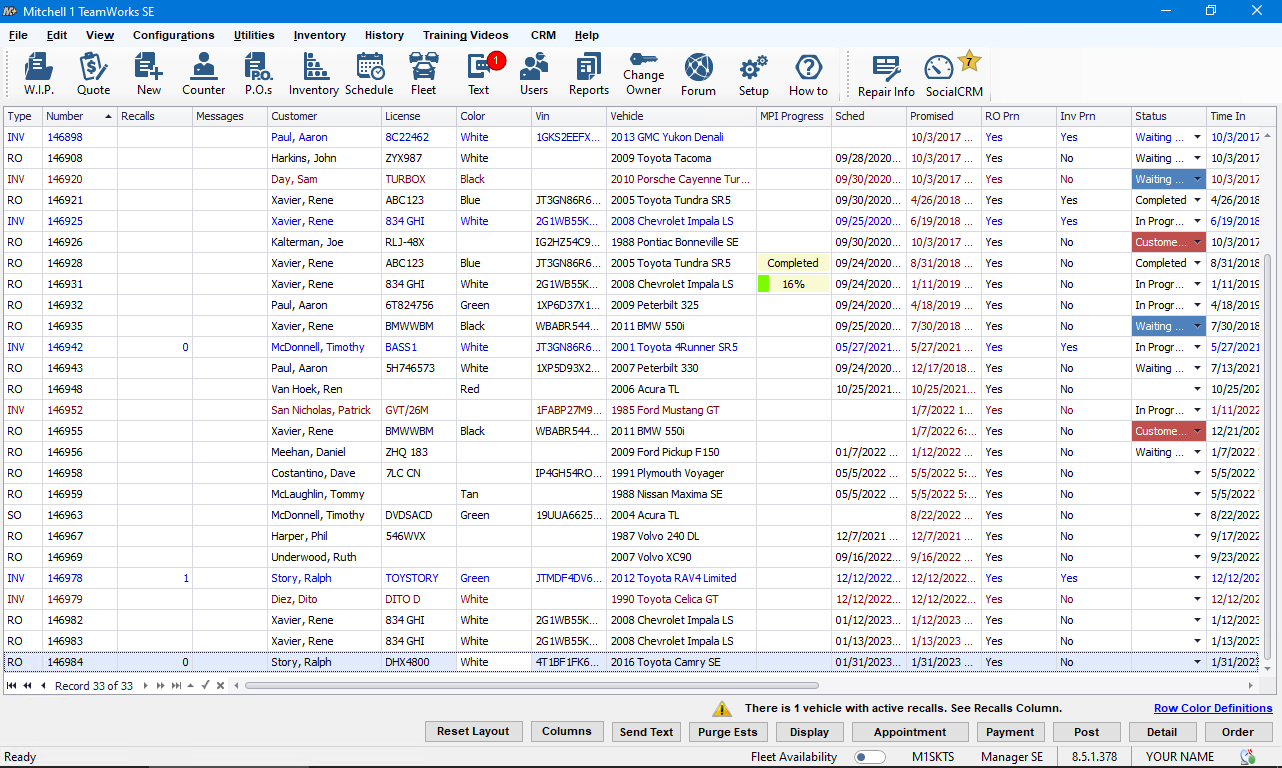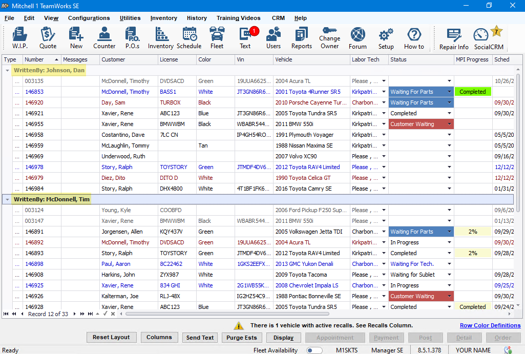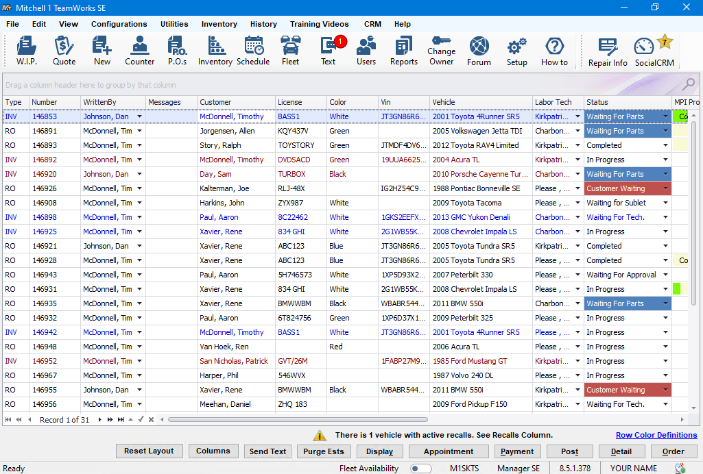 We made it possible to edit Repair Order data directly from the WIP screen; these fields include Written By (service advisor), Labor Technician, Status & Location. That saved users having to take it to the Order screen to make changes. As new Mitchell 1 products such as ProSpect MPI (inspections) and MessageCenter texting became available, new columns were added for real-time display of inspections progress and customer text messages respectively.