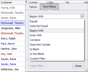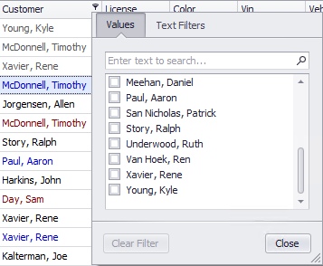 Next to each column header, there is a tiny glyph (golf tee icon) that opens a dialog box with display filter options. You might already be familiar with from using the Scheduler. You have checkbox options to display certain records (Customer names in this example) or switch to Text Filters where records are displayed.