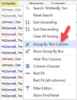 When you right-click on a column header in Manager SE 8.5.1, users will see an expanded menu of options. Take some time to look these over and see how you might apply them. I next want to share an exciting option that this new grid makes possible. I’m selecting the Group by The Column option on ‘Written By’ column to demonstrate.