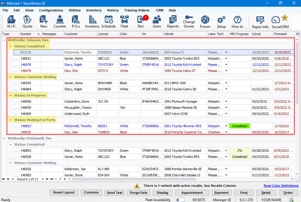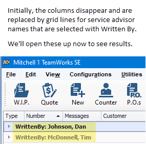 By clicking the triangle next to WrittenBy: <name> the repair orders are now grouped by the service writer and will not be changed by any WIP column sorts as it would’ve in the past. One service advisor’s list can even stay closed entirely.