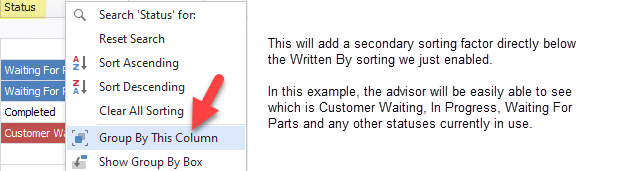 So now the Service Advisor has his reports grouped by status. This is just one of many groupings made possible by the new Group By This Column option. We encourage you to experiment to see what works best in your shop operation.