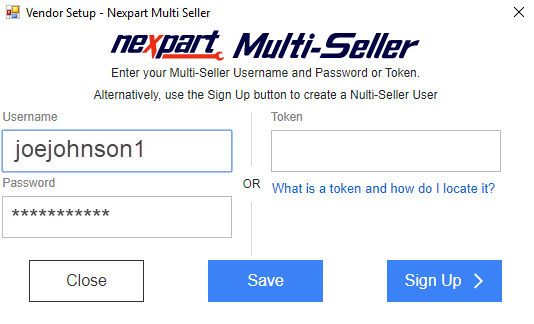6- The login screen will display, enter in your Multi-Seller username and password or use the Sign Up button to create a Multi-Seller user.• When you have entered in your user credentials or token select Save at the bottom of the screen.