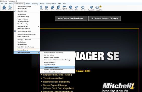 1- Within Manager SE go to the Configurations tab at the top of the screen, within the menu select Special Maintenance and Toggle Catalog Availability.