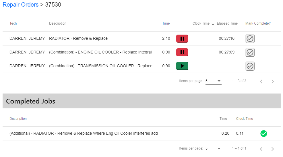 When a technician is about to start a job, they can login to the Time Clock Portal to then access the Job Clock tab. There they look through the open repair orders assigned to them, and click the green PLAY button to start the clock on the labor item that they will be working on. This makes it easy for your technician to start and stop on an assigned repair or maintenance job.