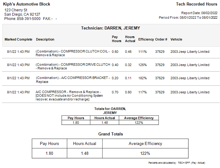 Once the job is finished, the technician can hit the COMPLETED button to finalize the labor item, showing that the job is now complete. The clocked time the technician recorded will now automatically be copied to the Actual Hours field for that labor item on the repair order. This saves the shop time required to track the work and then enter it into the repair order to drive the Technician Productivity report. The Tech Recorded Hours report (shown below) can be printed from the Tech Job Card tab.