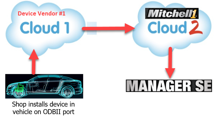 In 2017, Mitchell 1 demonstrated a prototype communication pathway happening in real-time between a telematics device on a vehicle’s ODB-II port transmitting data back to the device vendor’s cloud. This data was then forwarded to the Mitchell 1 cloud and down to a specific shop’s Manager SE system, arriving and displayed as a service alert – delivered via the cloud.
