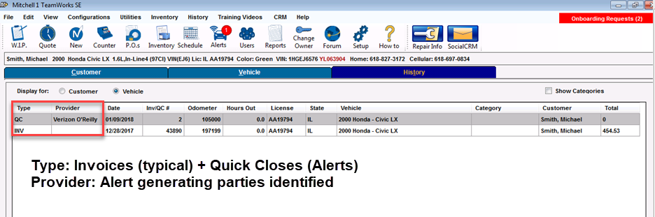 Customers/vehicles will be identified as Existing (in the shop’s database) or to be on-boarded as New to the shop. Service alerts will either convert to estimates/repair orders or be solved outside of shop work as a Quick Close.