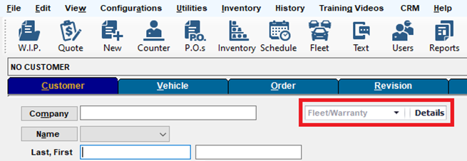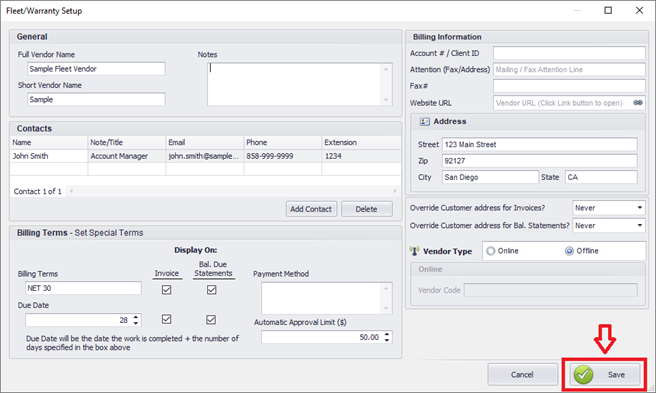 The Fleet/Warranty Setup screen allows data entry of all contact, billing, and terms associated with the fleet vendor. This includes settings for 3rd party billing in which the fleet vendor’s contact information can be used in place of the customer’s info.