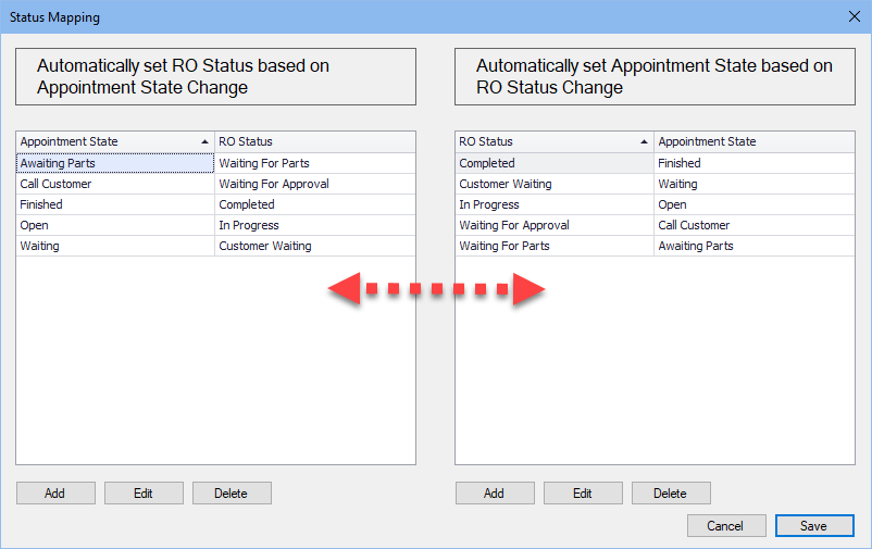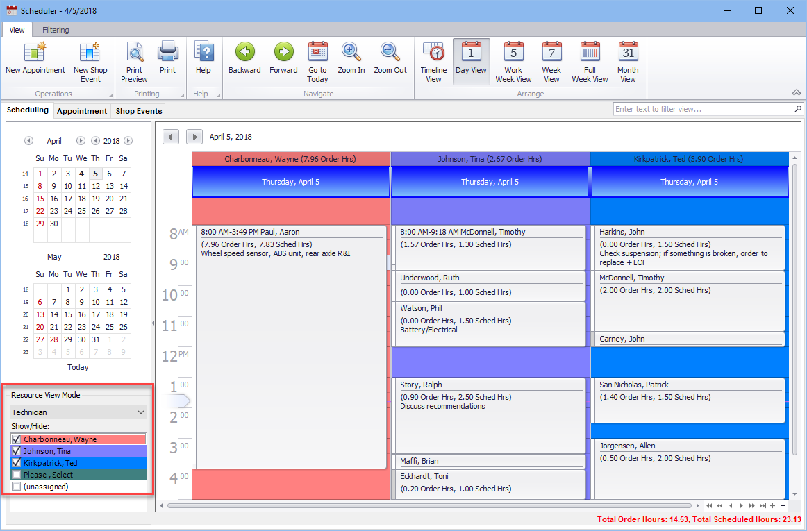 Shops can choose one of two workflows: (1) Start with a scheduled appointment and later convert that to an Estimate or Repair Order, or (2) Start with an actual Estimate and then convert that to an active Repair Order. The appointment for this R.O. is generated automatically in the Scheduler per the labor technician assigned. Using Status Mapping, shops can customize both their R.O. appointment statuses so they stay in synch as updates are made. to (as illustrated below.)