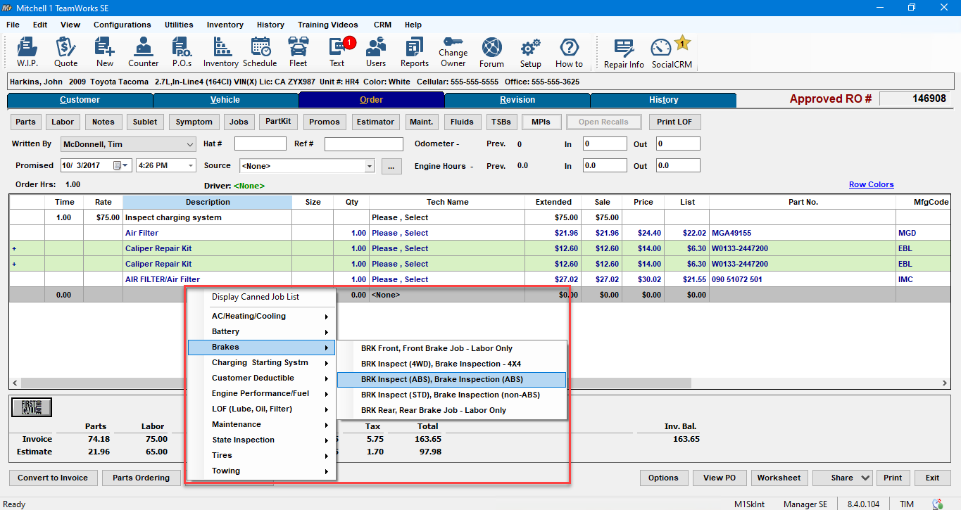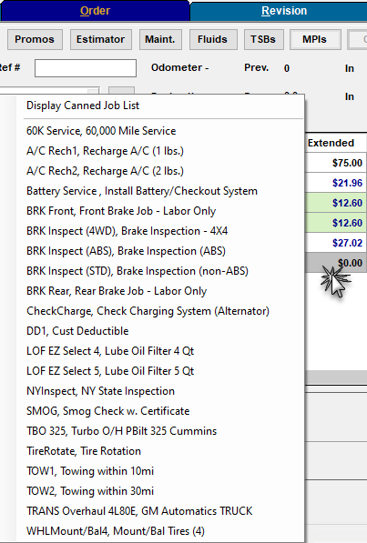 Once upon a time, when computer screens were small, Manager SE users could right-click on the “.00 line” (always the last line on the Order screen grid) for Quick Menu access to their “Top 10” Canned Jobs. These jobs were selected to display in this list by checking the “Include in Quick Menu” box in each desired Canned Job record in the shop’s database.