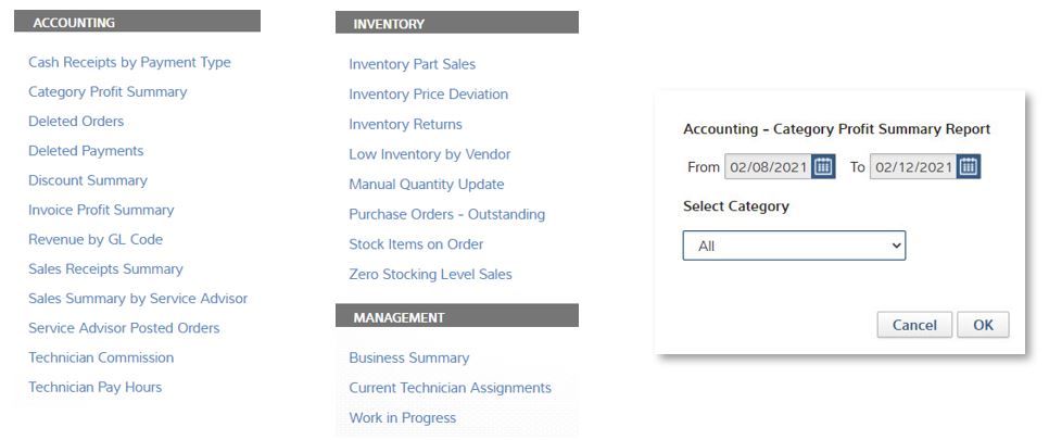 Once enabled, users may login to Shop Reports and select a report from the Accounting, Inventory and Management categories (Image 5) as most likely to be accessed when the owner or manager is away from the shop.