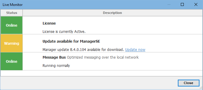 Clicking on the ”satellite” icon (Image 1), opens the Live Monitor screen (Image 2). This screen informs users (and potentially tech support) of the current Manager SE software license status – unique for each workstation PC. It also informs users that an update is available for Manager SE and provides a link to download the latest version, if available. Hovering the mouse over the satellite icon will also reveal any software update availability messages (Image 3).