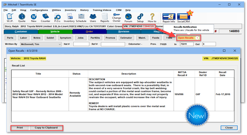 Once the Open Recalls button is clicked, recall information can be copied and pasted as a note in your repair order, or simply printed and left in the vehicle/handed to the customer so they are reminded to get it done. SE Connection makes it possible to share this exclusive Manager SE data feature with your customers.