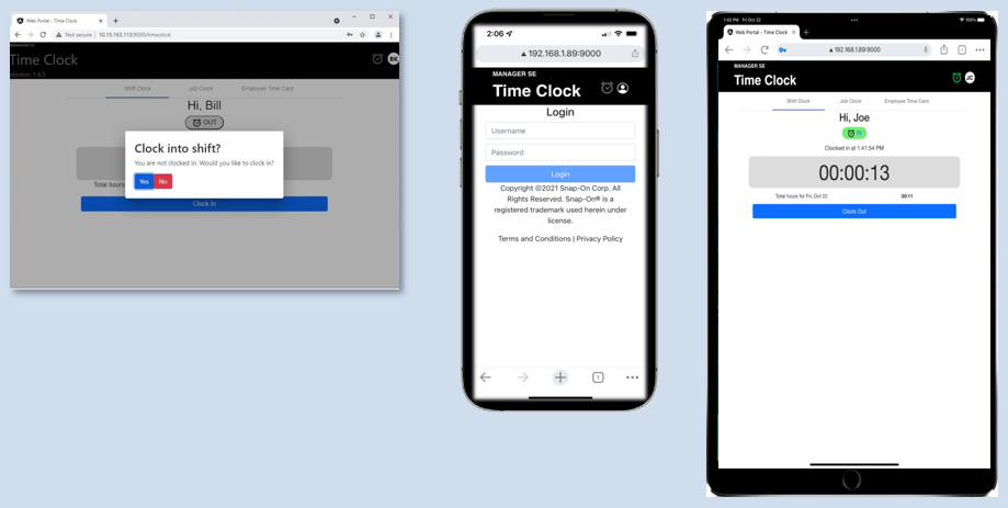 The new Job Clock is driven by labor operations from Manager SE repair orders. It allows technicians to view, ‘clock in’ and ‘clock out’ of labor operations assigned to them from Manager SE repair orders. It can be accessed from a Manager SE workstation PC, smartphone or tablet on the shop’s local area network using a modern web browser.