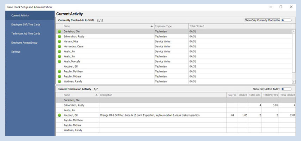 Time management details are all presented in a secure, intuitive dashboard, allowing owners and managers to quickly confirm which employees are clocked in for their workday shift. Current Technician Activity supports verifying technician workloads for jobs assigned, with Pay Hours, Clocked Time and Total Jobs they have completed. (See below – click image to expand to full size.)