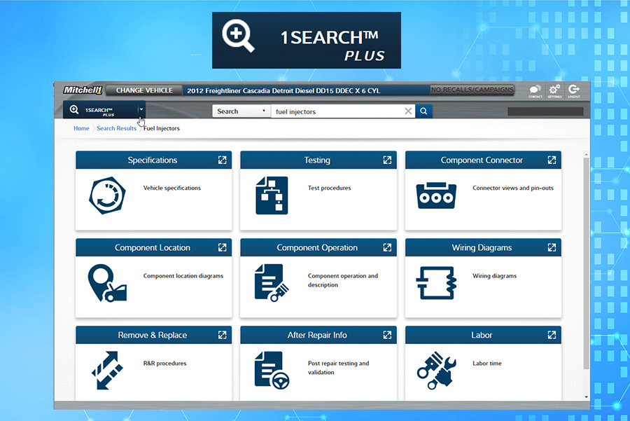 Improve your information lookup with 1Search™ Plus, our advanced search technology that scans the vast database of Mitchell 1 content and returns only the specific information you need. It’s all targeted to the Class 4-8 truck in your bay in an easy-to-use graphical design.