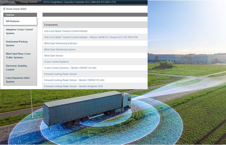 TruckSeries truck repair software makes it quick and easy to find the information needed to diagnose, repair and calibrate trucks equipped with ADAS — Advanced Driver Assistance Systems. Simply select a vehicle, click the Driver Assist (ADAS) Quick Link button, and you have immediate access to a table that consolidates all the ADAS information for the vehicle in a single location.