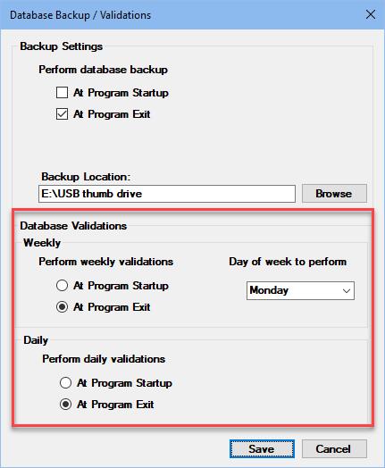 All users need to do is select either ‘program startup’ or ‘program exit’ as the trigger time. Daily validations run for a moment prior to writing a copy of the SE database to backup media as usual. The Weekly Validation requires a Day of Week to perform selection and then you’re all set.