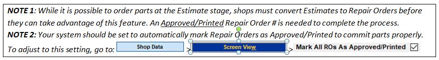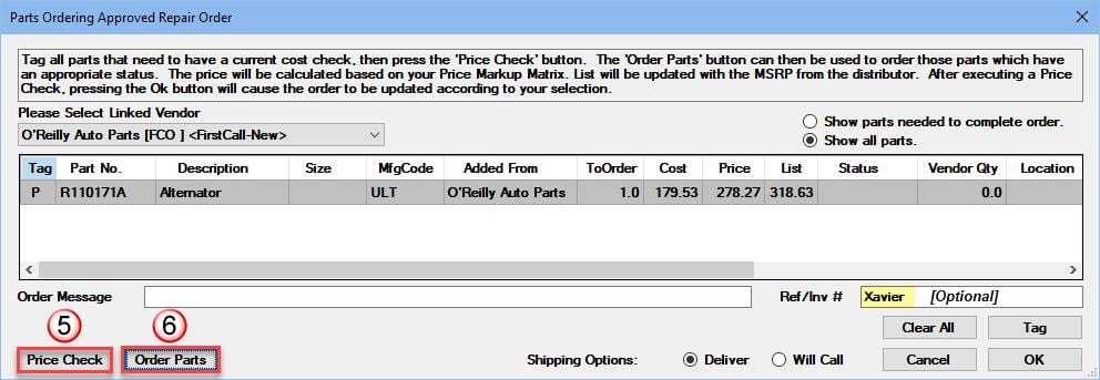 - Now click on Order Parts; this transmits the electronic P.O. to the vendor.