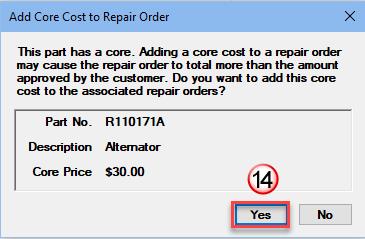 - If there is a core involved with your part, this Add Core Cost box will appear. This provides an additional opportunity to add the core charge to the customer’s invoice. If no core, disregard this and continue to step15.