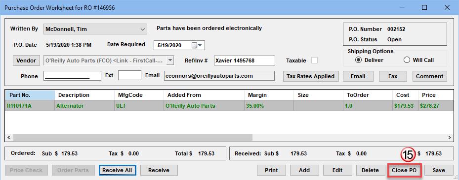 The part(s) have been ordered electronically from the vendor and now the shop now waits for their delivery.When the vendor part(s) arrive, they need to be received into your system and specifically to this Repair Order: - With the intended Repair Oder open, click on the View PO button to start the process.