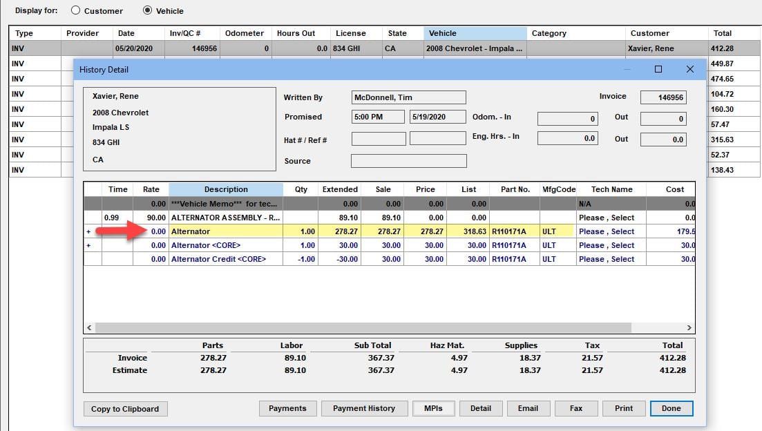 To help shops get this done with less effort, a feature was added so that a vendor’s invoice # can be entered just once on the P.O. Worksheet and then copied down to all parts ordered on that P.O. This would be visible for each part ordered; now on the Order screen or later in the History screen invoice. Later when a part is found to be defective, it would just be a matter of looking up the history invoice part details. Opening that part line instantly reveals that vendor’s invoice #.