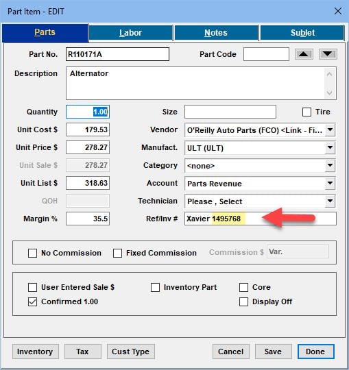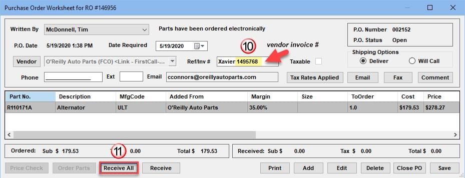 - IMPORTANT: You must enter the vendor invoice # (on vendor’s parts bill) into the Ref/Inv # field now. NOTE: If you previously entered something in Ref/Inv # field, vendor invoice # will be appended to it.